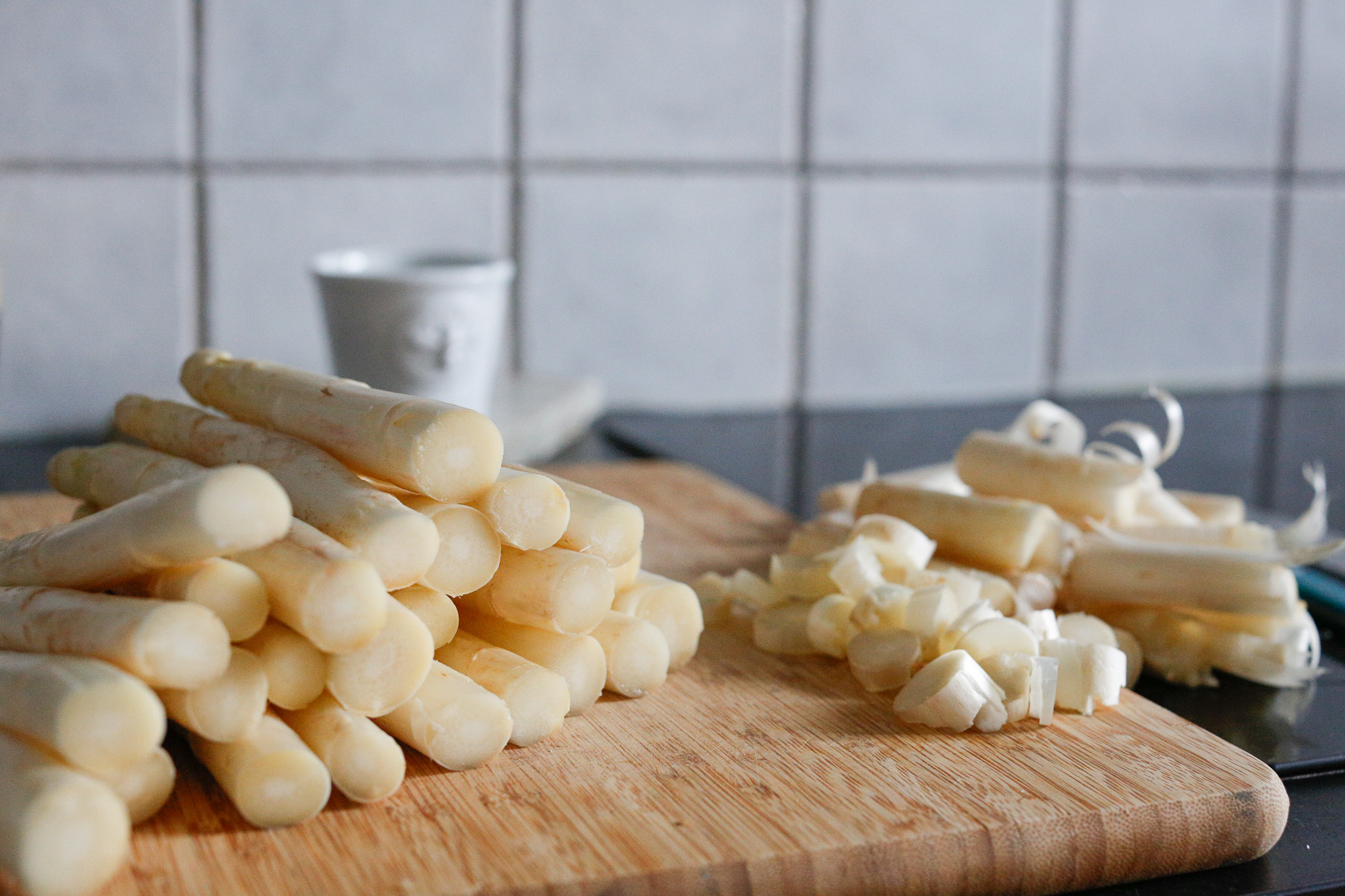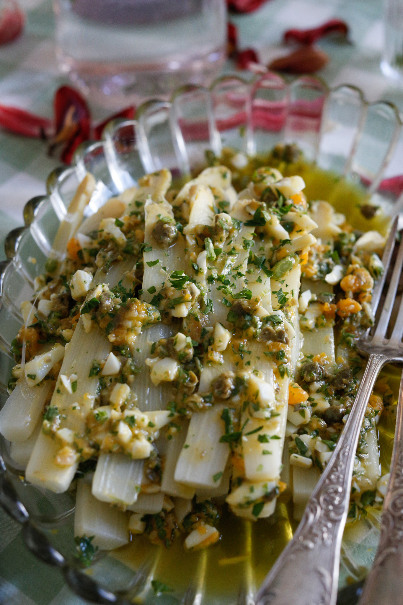 I have just barely adjusted the recipe to suit my palate and I encourage you to do so as well. I like to separate out the steps to lighten my load. By doing this, the recipe has become super manageable and thus one of my favorite ways to eat and serve asparagus. I am using white asparagus but I’ll also use green sometimes. I cook the asparagus and the eggs a day or two before and that leaves making the vinaigrette and assembling the dish the day of.