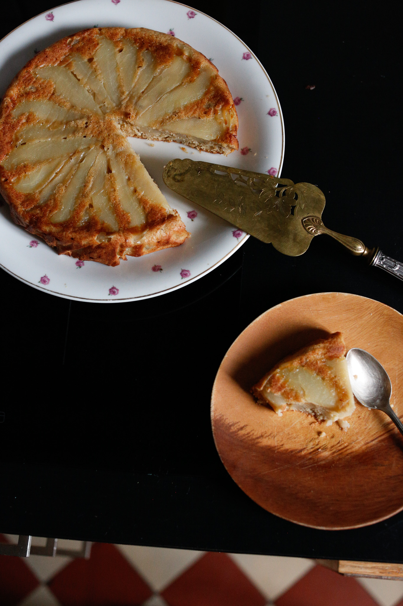I love this cake because it truly highlights the pears. It’s light and has very little sugar. I usually make this for a goûter (snack.) If I’m making it for a dessert I usually drizzle Pineau des Charentes over the top as it comes out of the oven or serve it with creme anglaise or a creme fraîche (sour cream.)