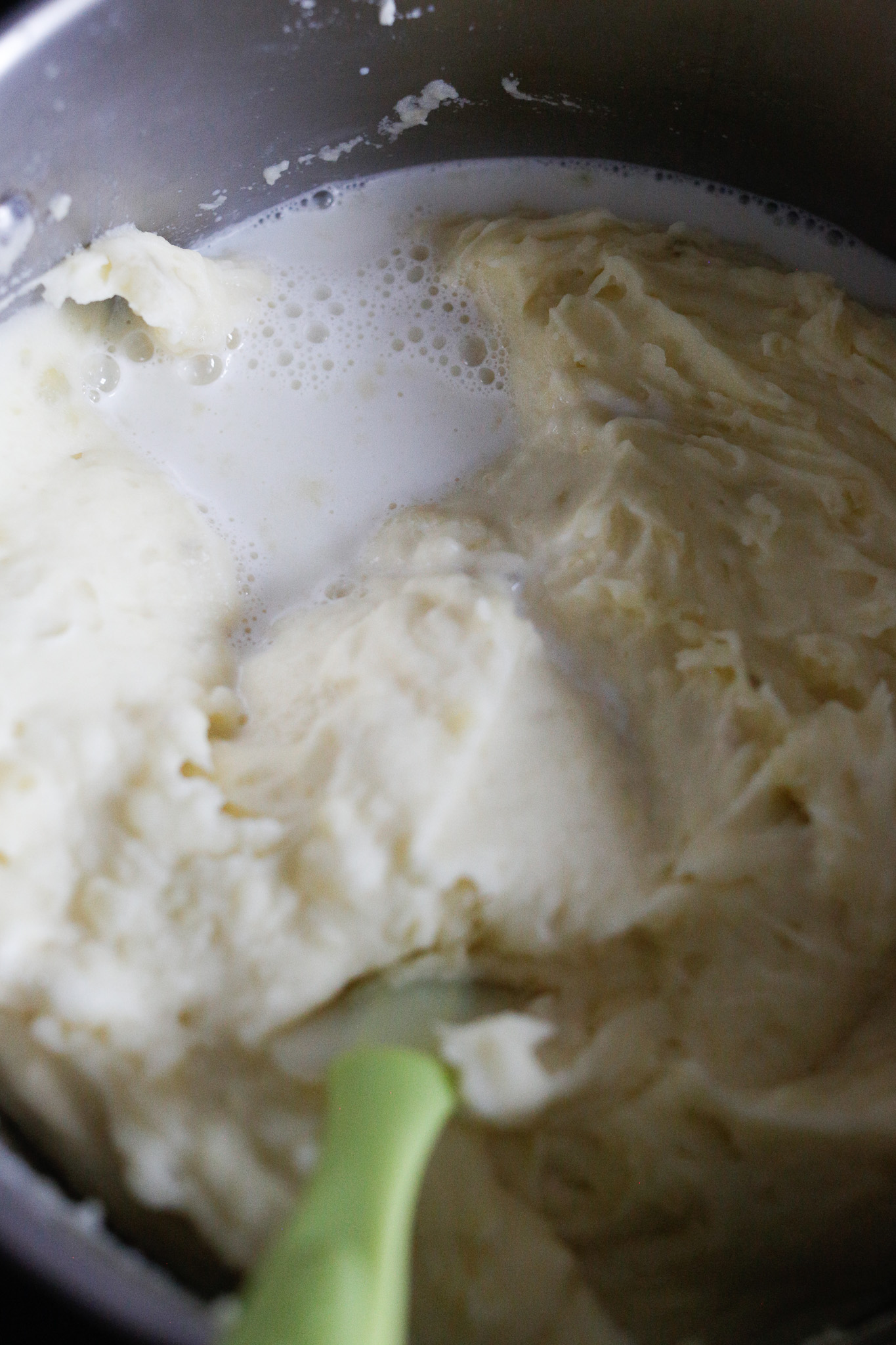 As you beat, continue adding in your milk. Your potatoes will get creamier and creamier
