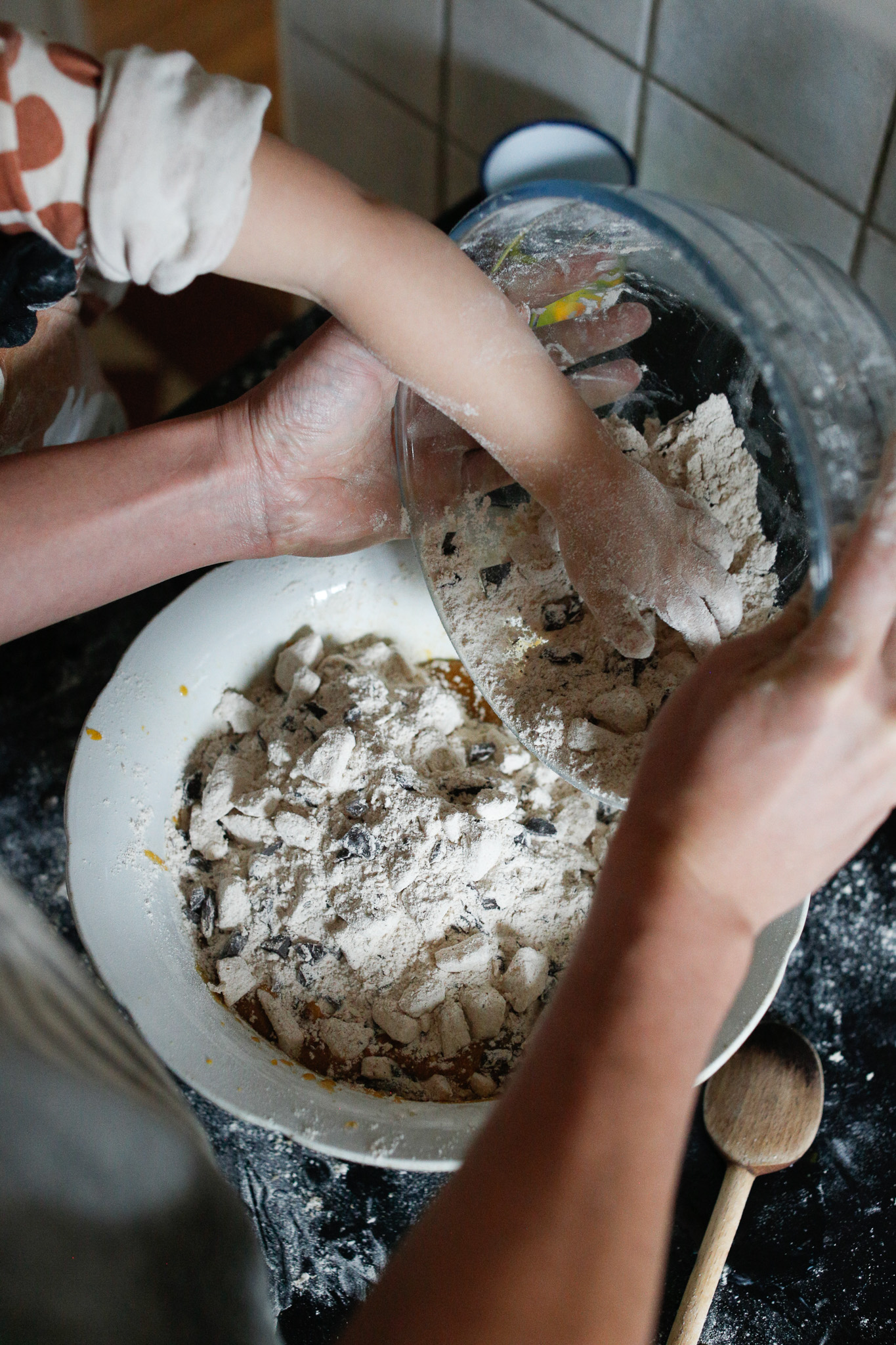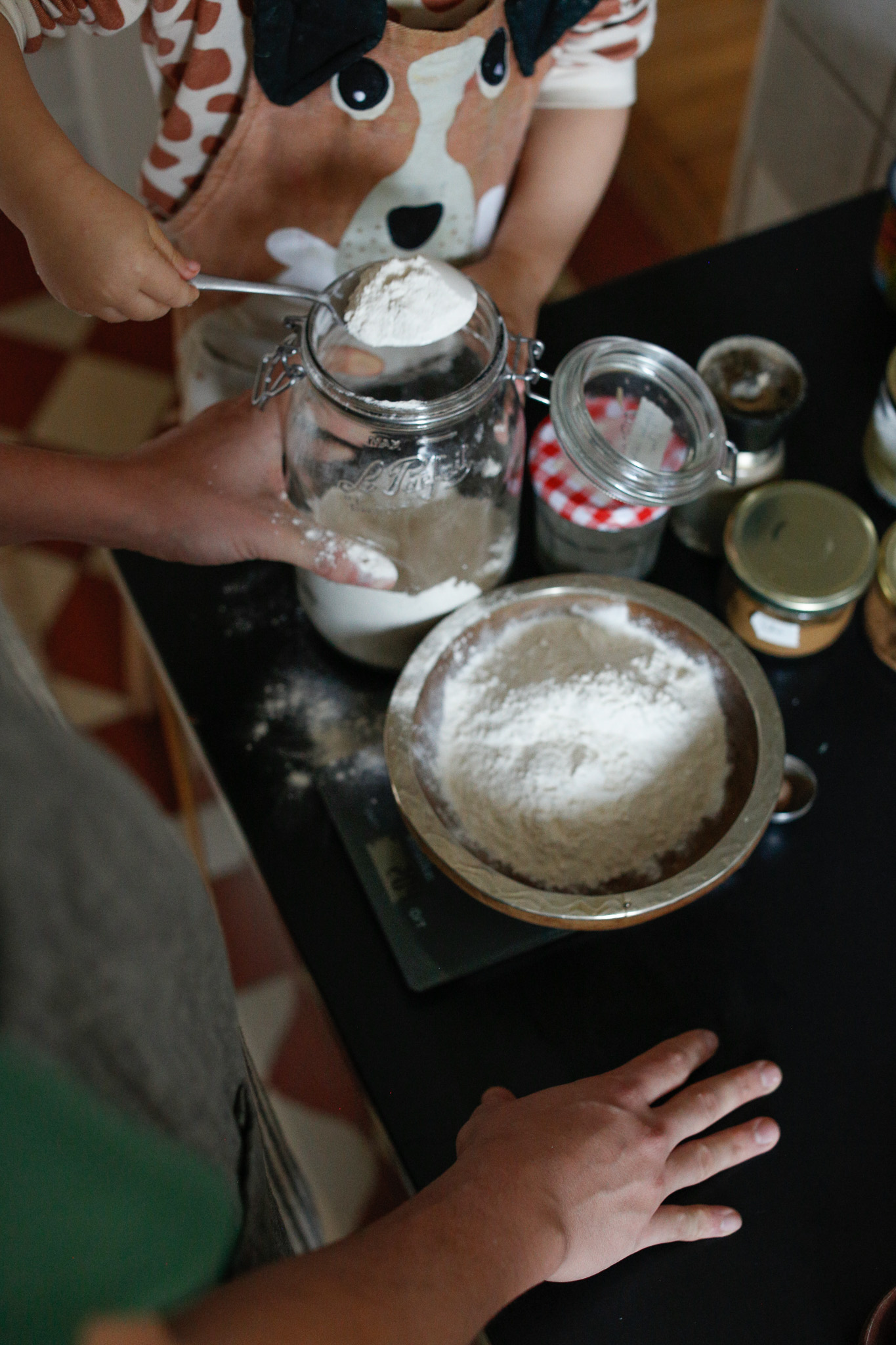 I have found it very useful to eliminate my phone to reference the recipe and write out each of the wet and dry ingredients on post-it notes that I stick on the cupboard. This way I have all their quantities at eye level, hands free. This makes it so much easier to read and just be present with my daughter.