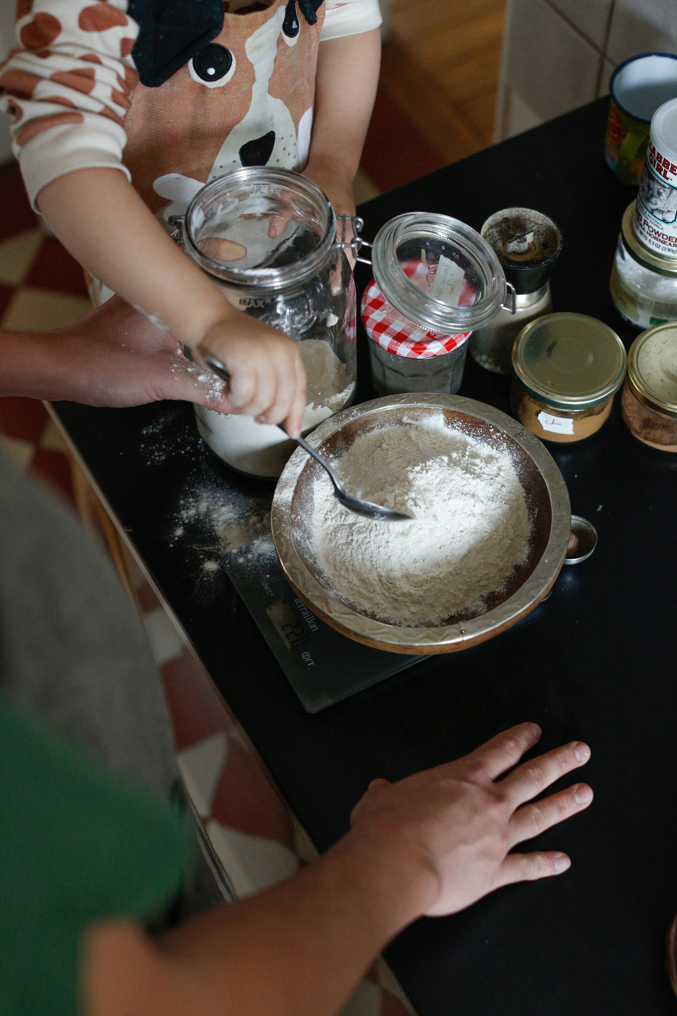 Her daddy scrapes off the excess baking powder while measuring out with teaspoons. Practicing team work that we call "together"