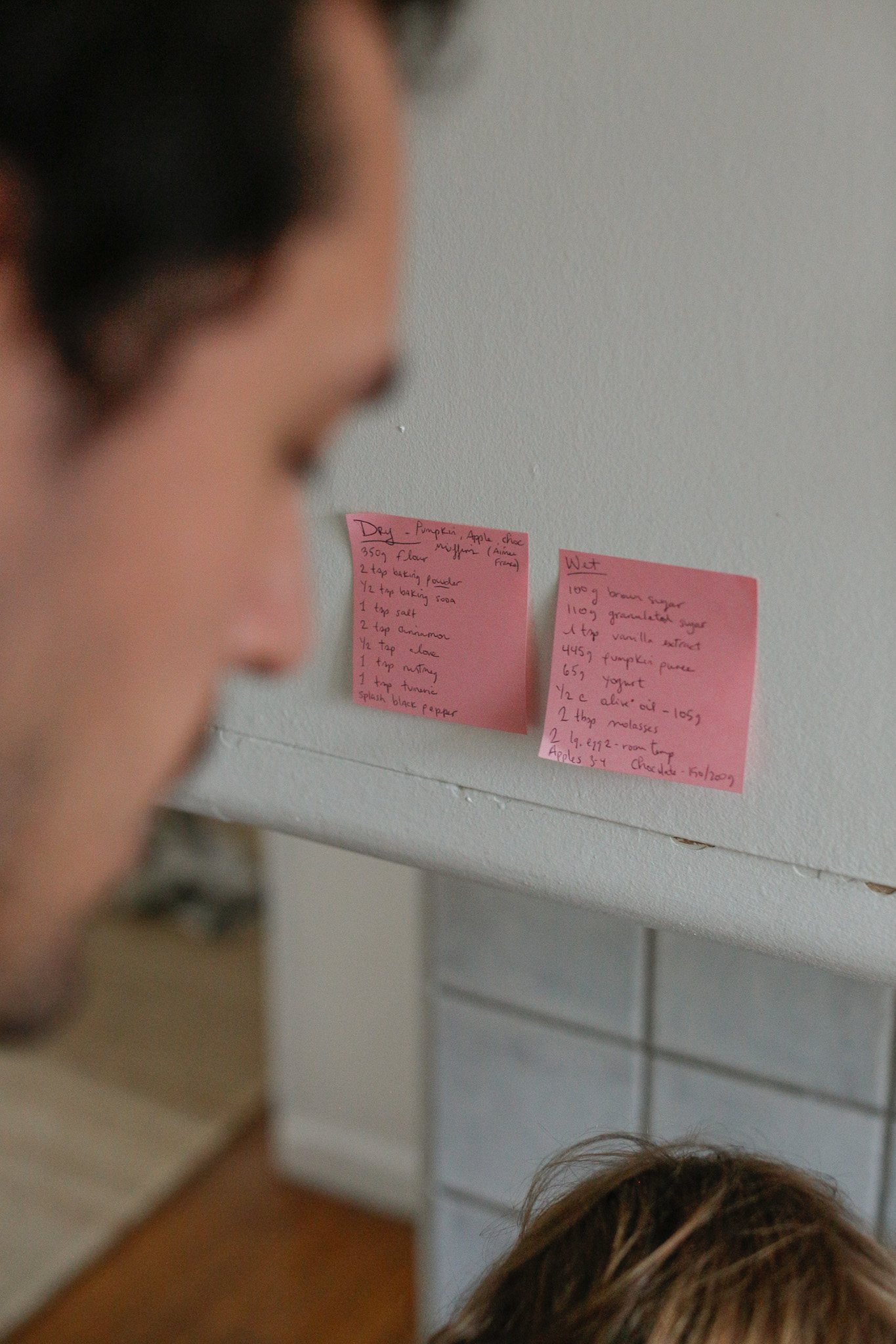 ****if you are new in your kitchen journey with your kiddo I always recommend setting yourself up the best you can. I have found it very useful to eliminate my phone to reference the recipe and write out each of the wet and dry ingredients on post-it notes that I stick on the cupboard. This way I have all their quantities at eye level, hands free which allows me to be present with my daughter.