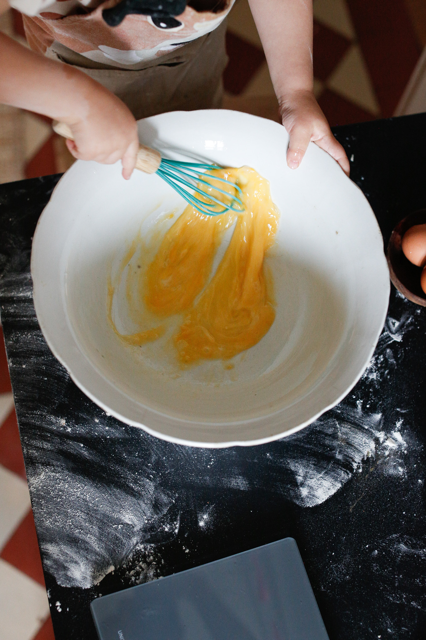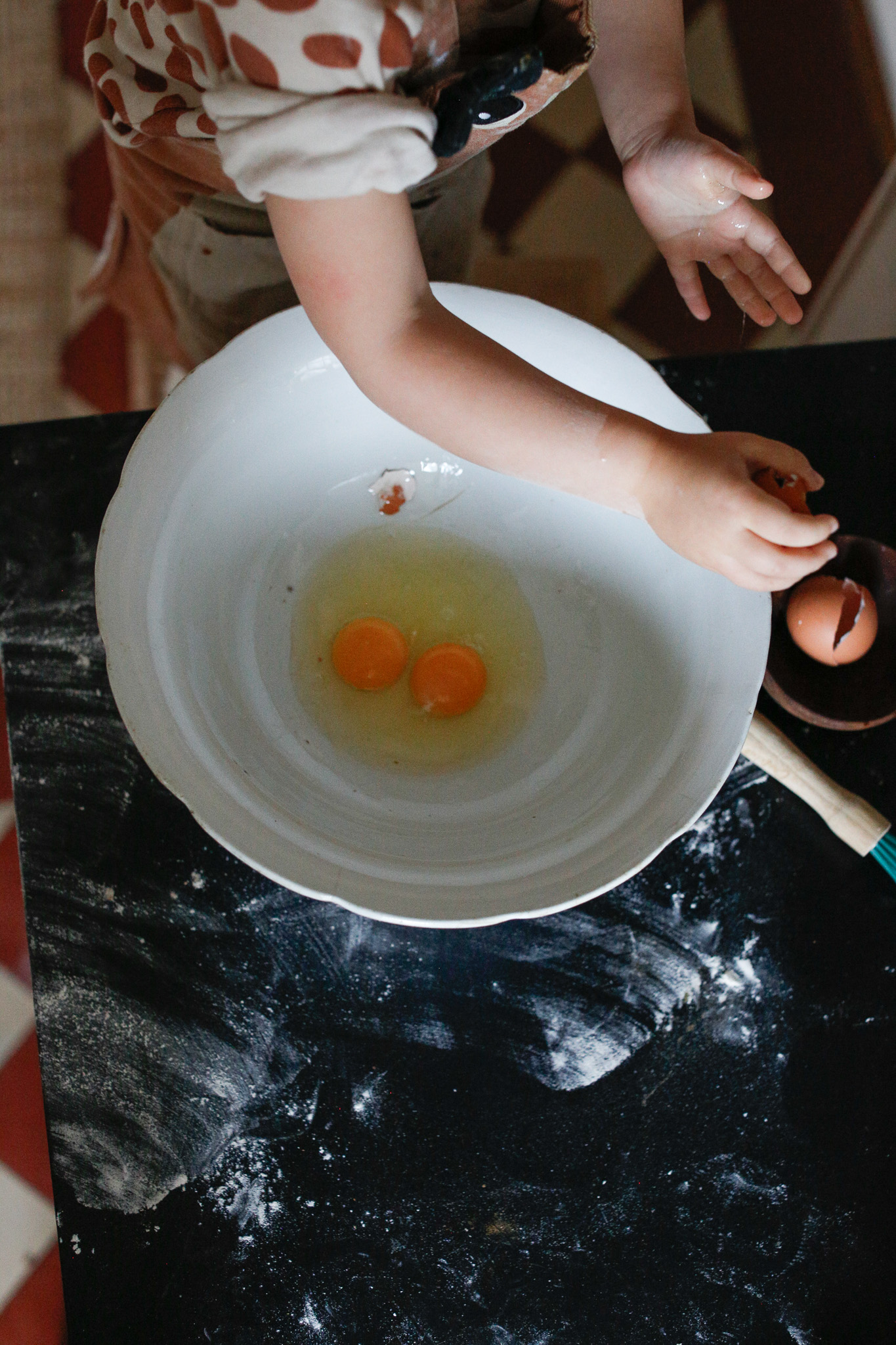 The small nuances of having your child discard the eggshells after cracking supports them in following through with a task, rather than taking the shells from them