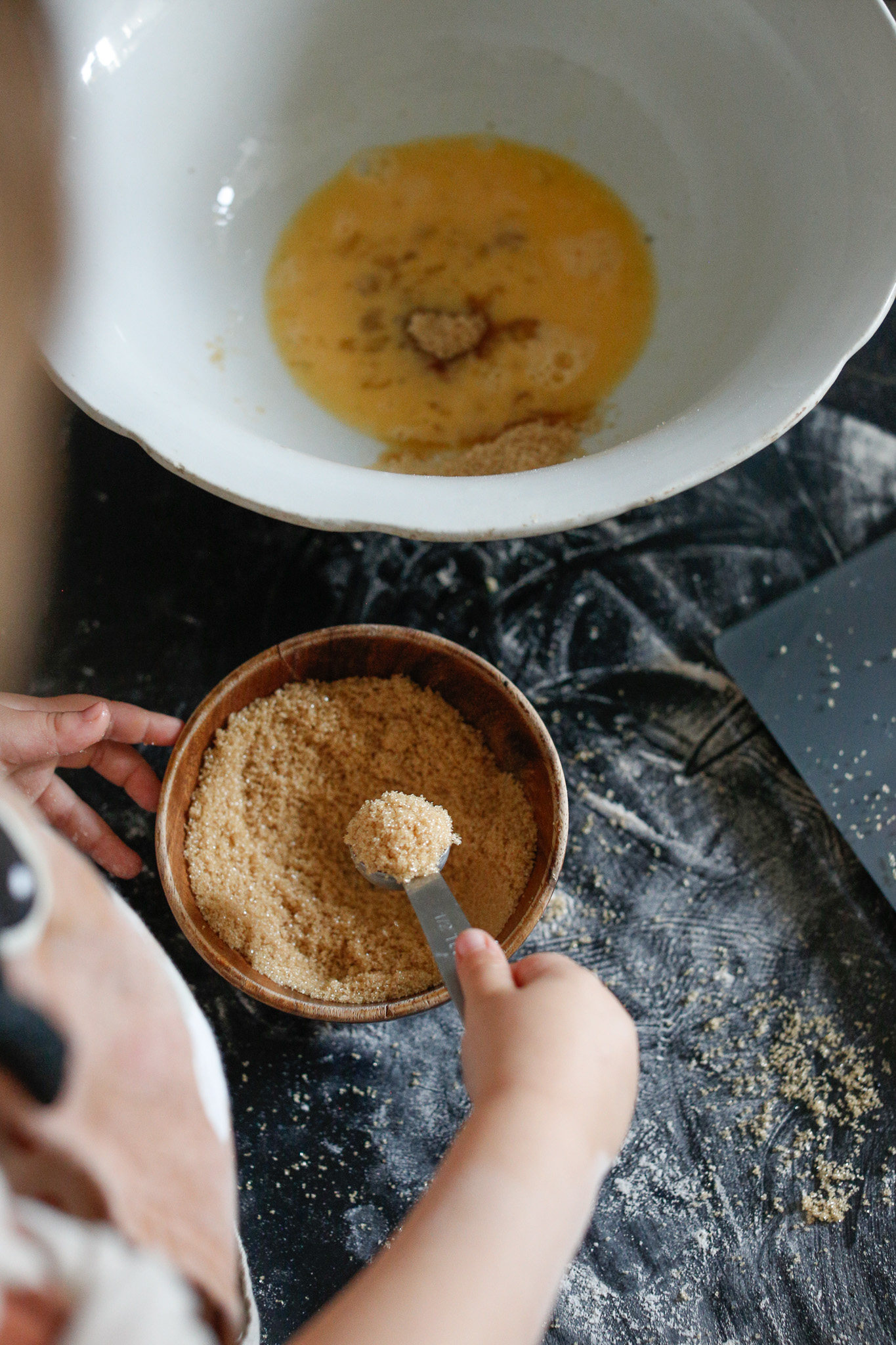 She wanted to use a tsp to transfer the brown sugar from the measuring bowl to the stirring bowl. It can be annoying but her daddy supported her to do it. It’s her experience!