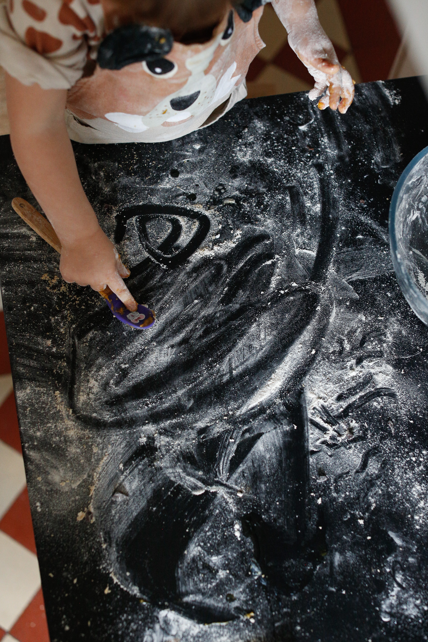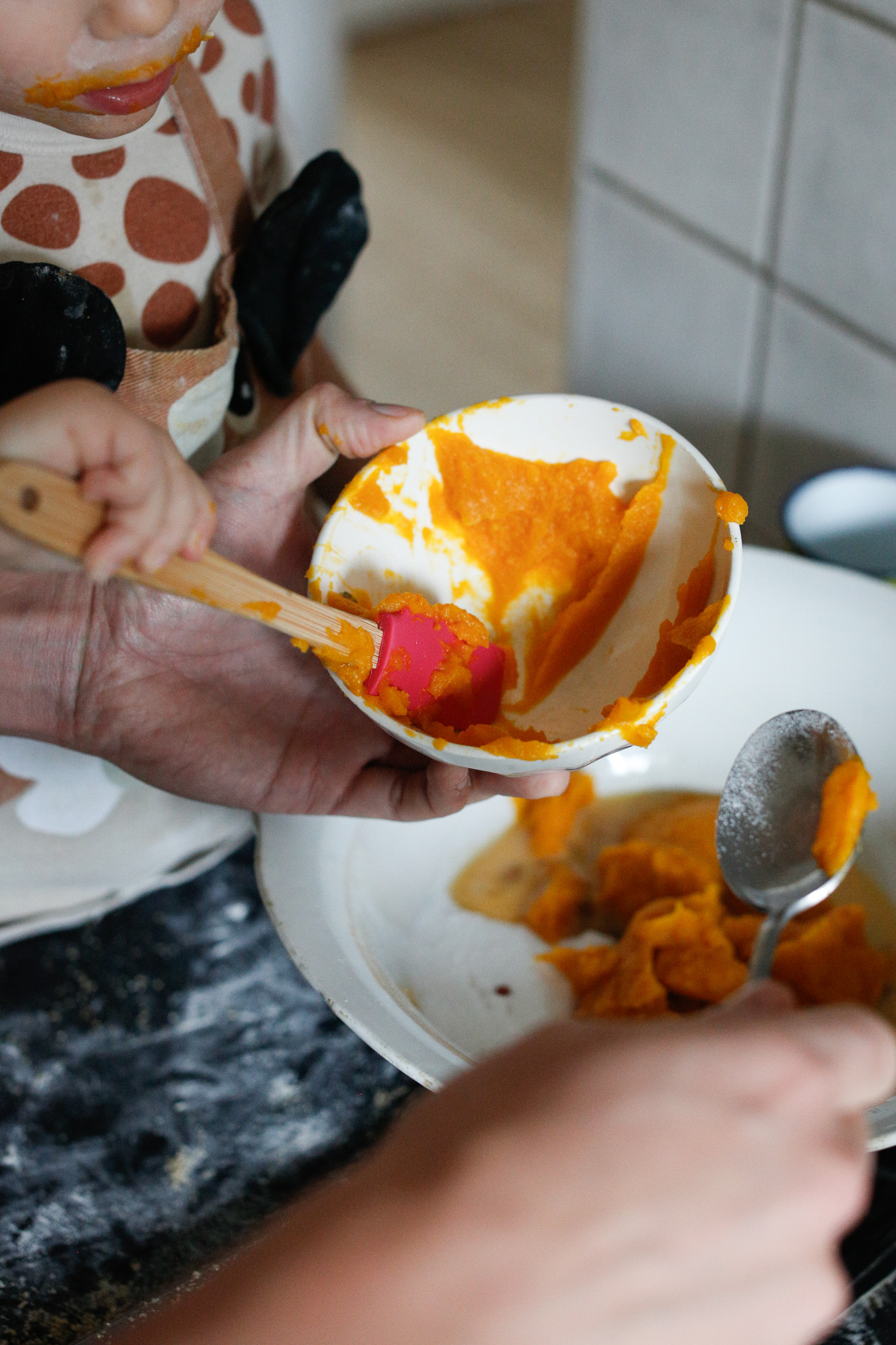 Using the spatula is very tricky for kiddos. Takes lots of practice. Notice the orange mouth from non-stop tasting ...
