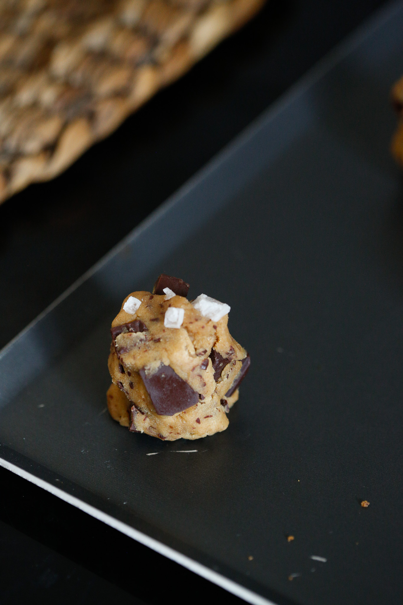 6- Proceed to make cookie dough “towers” (see photo below for visual) and add your maldon salt on top of each tower. Make sure to stick the salt into the dough or it will fall off. Space them out on your cookie sheet to allow spreading. I usually bake no more than 8 at a time.